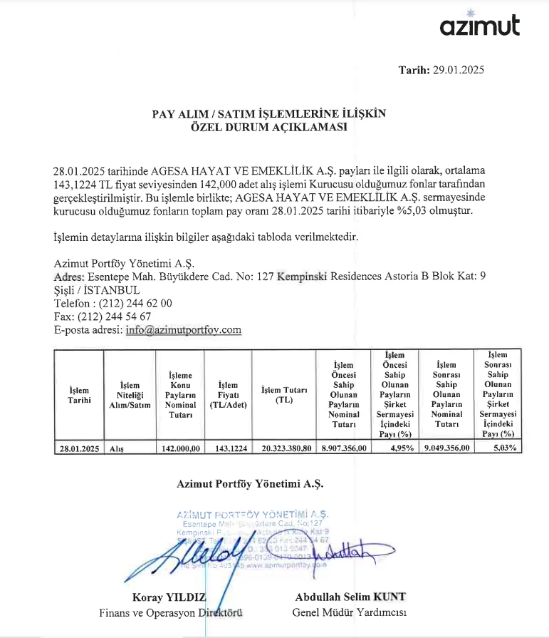 Azimut Portföy Yönetimi A.Ş., 29 Ocak 2025 tarihinde Kamuyu Aydınlatma Platformu’na (KAP) yaptığı açıklamada, Agesa Hayat ve Emeklilik A.Ş. (AGESA) hisselerinde gerçekleştirdiği alış işlemini duyurdu. Şirket, yaptığı bildiriye göre fonlarına ait pay oranını artırdı.