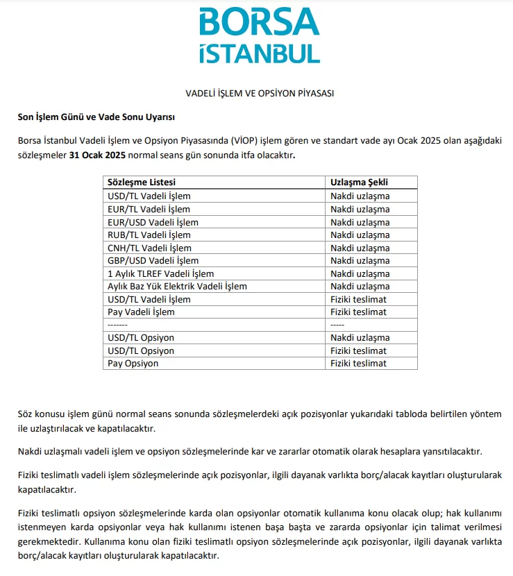 31 Ocak 2025 tarihindeki normal seans gün sonunda söz konusu sözleşmelerin itfa edileceği belirtildi. Açık pozisyonlar, ekli tabloda belirtilen yöntemler doğrultusunda kapatılacak. Detaylar şöyle: