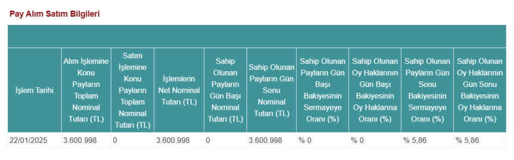 Özel Durumlar Tebliği (II.-15.1)’nin 12. Maddesi gereğince Hedef Portföy’ün kurucusu olduğu yatırım fonlarının, KGYO hisselerinde ulaştığı yeni oran Kamuyu Aydınlatma Platformu (KAP) üzerinden duyuruldu. Bu kapsamda, 22 Ocak 2025 tarihinde 3.600.998 TL nominal değerinde hisse alımı gerçekleştirilerek, hisselerin toplam oranı %5 sınırını aşarak %5,86 seviyesine yükseldi.