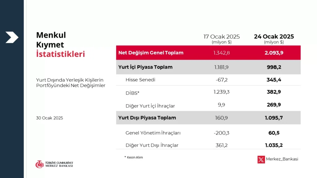Türkiye Cumhuriyet Merkez Bankası (TCMB), 24 Ocak haftasına dair haftalık menkul kıymet istatistiklerini açıkladı. Bu verilere göre, yurt dışında yerleşik yatırımcılar 24 Ocak haftasında hisse alımlarına yöneldi ve borsadaki satış trendini tersine çevirdi.